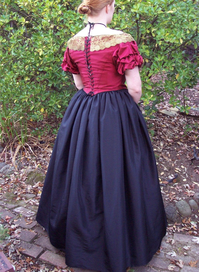 I used Past Patterns Ball gown Bodice #704, and just made the skirt up as I went. The black lace was stolen off of an old lace bed jacket from the 80's!