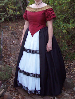 I used Past Patterns Ball gown Bodice #704, and just made the skirt up as I went. The black lace was stolen off of an old lace bed jacket from the 80's!